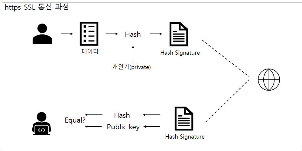데이터를 해쉬 알고리즘을 통하여 전자 서명을 만들고 서버 쪽에서 hash 알고리즘과 공개 key를 처리를 했을 때 같은지 안 같은지 확인해주는 것이 SSL이다.